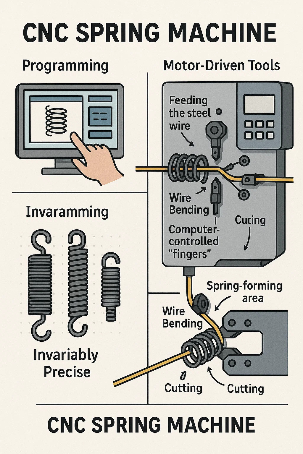 There's a machine specifically designed to manufacture springs called a computer-controlled spring machine (or numerically calibrated spring machine). Its core is using a computer (CNC system) to control the entire spring manufacturing process.