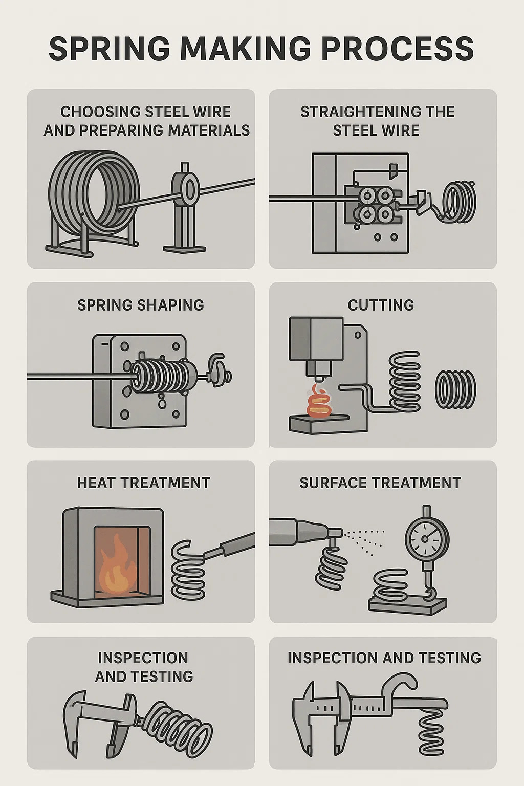 • Quenching: The spring is quickly placed in oil or water to cool and harden the steel wire.