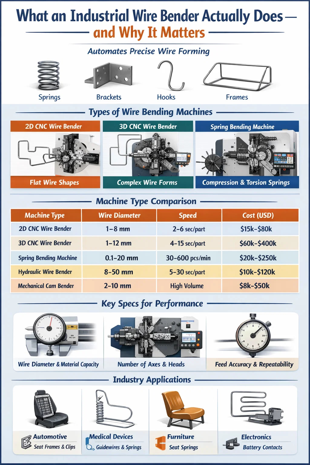 | 3D CNC Wire Bender | 1–12 mm | 4–15 sec/part | Complex spatial forms, automotive, medical | $60,000–$400,000+ |