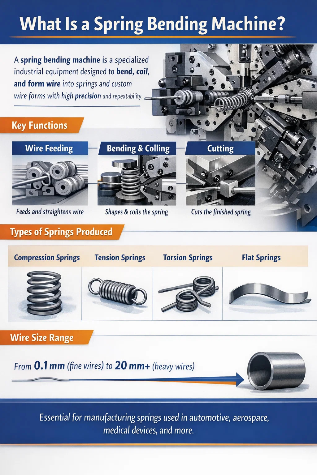 A spring bending machine is a specialized piece of industrial equipment designed to bend, coil, and form wire or strip material into springs and spring-like components. It controls the shape, pitch, diameter, and end configuration of each spring through a combination of feeding, bending, and cutting mechanisms. Unlike general-purpose wire forming machines, a spring bending machine is optimized specifically for producing compression springs, tension springs, torsion springs, flat springs, and custom-shaped wire forms with high repeatability and minimal manual intervention.