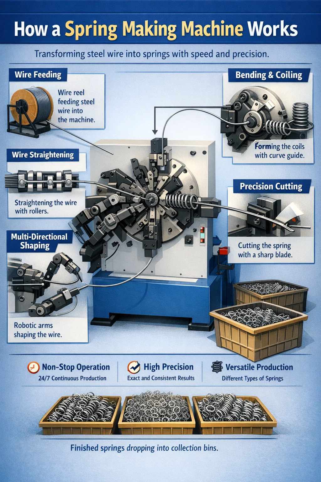 To transform a straight steel wire into a flexible spring, the machine typically goes through these steps:
