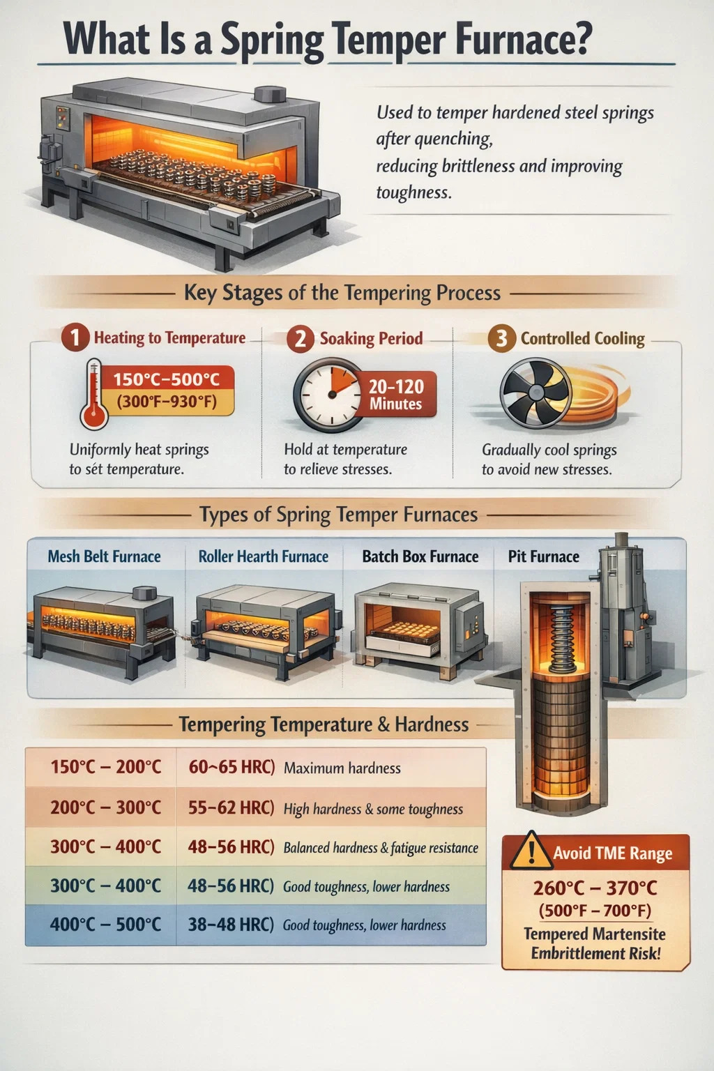 | Spring Tempering | 150°C – 500°C | Reduce brittleness after hardening, set final mechanical properties | Reduces hardness from as-quenched to specified target |