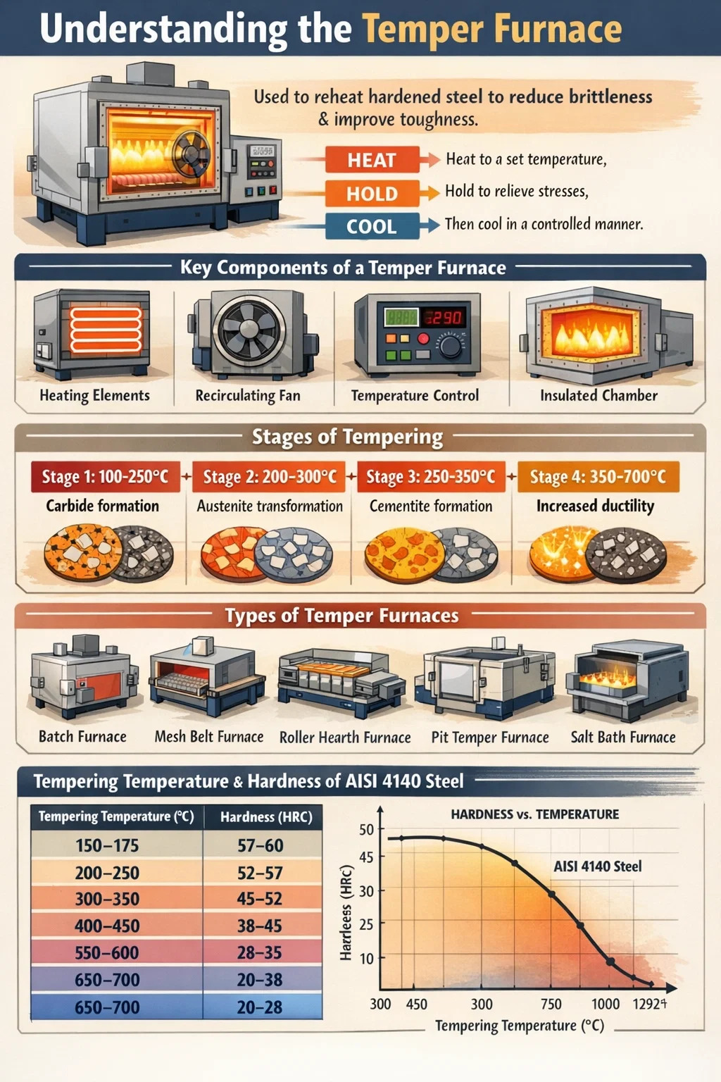 To put it plainly: after steel is hardened, it becomes extremely hard but also dangerously brittle. A temper furnace is the tool that corrects this imbalance. It transforms a brittle, stress-loaded part into a component with a carefully calibrated combination of hardness and ductility — suitable for real-world mechanical loads.