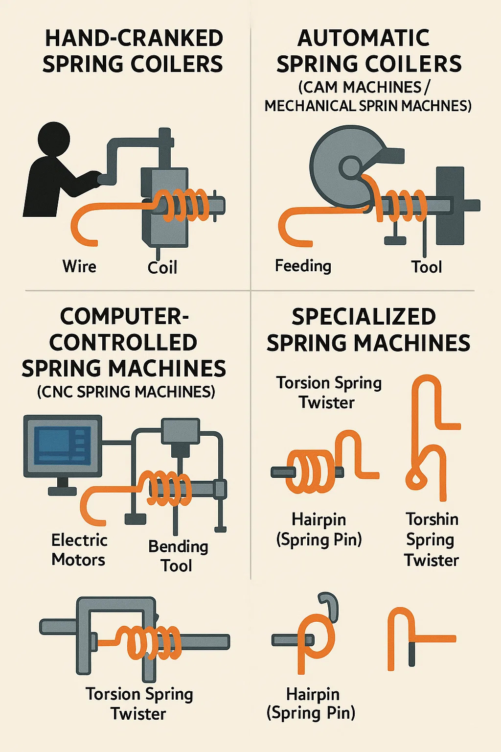 •Hairpin (Spring Pin) Machines: Make small, straight springs with bent ends, often used in locks or clutches.